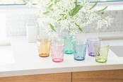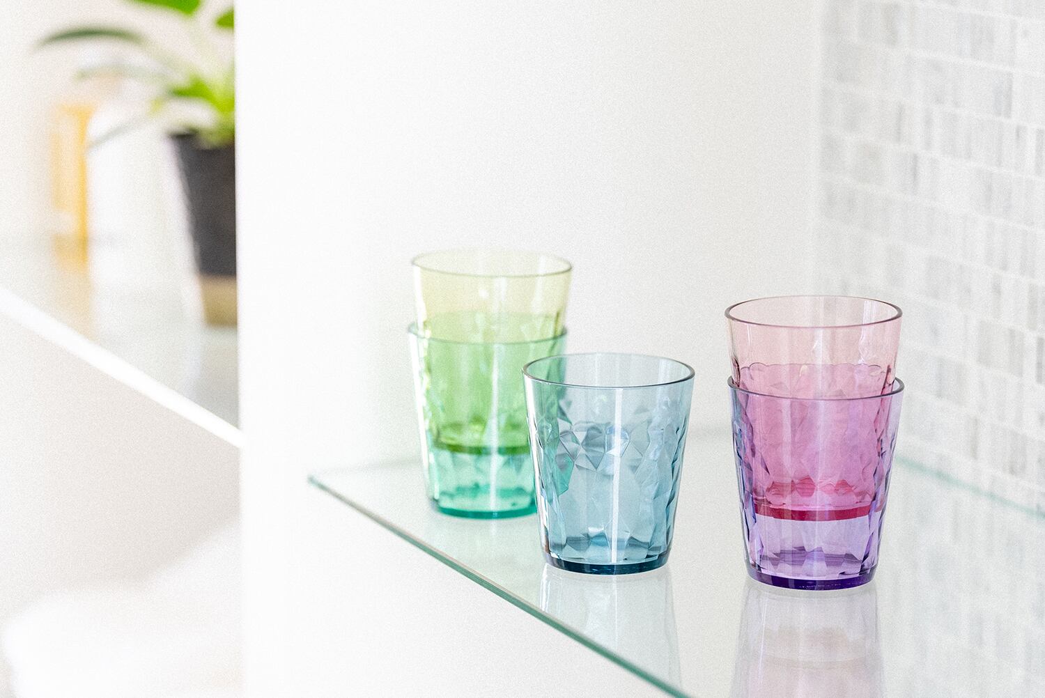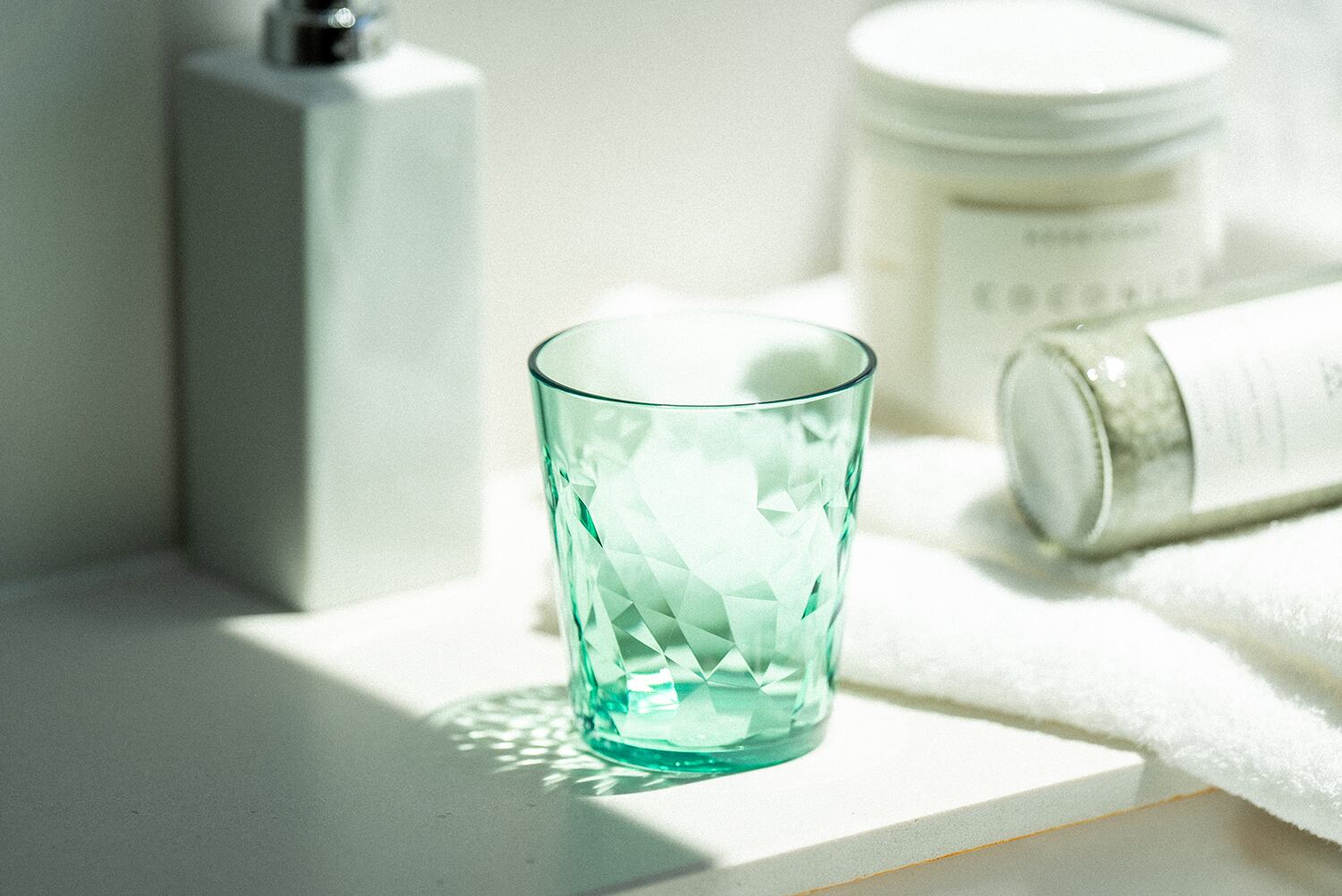 内側に施されたダイヤカットが、このグラスの最大の特徴。光を受けるとキラキラと輝き、透明感のあるカラーと相まって、食卓に美しい彩りを添えます。飲み物を注ぐとカットの模様が一層映え、いつものジュースも特別な一杯に見えるデザインです。
